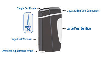 Эта модель имеет спусковой механизм вдоль корпуса, таким образом палец больше не должен распологаться рискованно близко к пламени. Негабаритное колесо регулирования гарантирует быструю подстройку пламени. Простой толчок одновременно открывает крышку и зажигает сильное реактивное пламя.