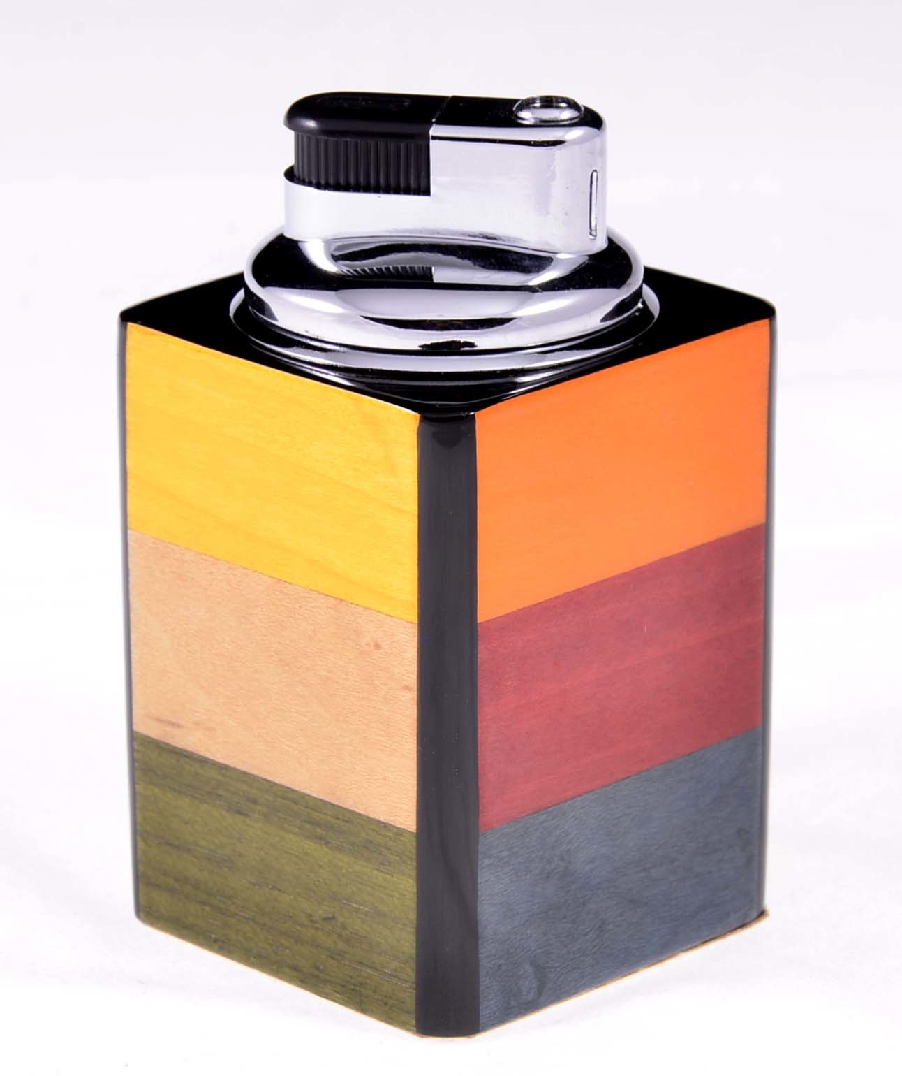 Зажигалка выполнена из массива дерева с отделкой шпоном разных пород и окраса. Газовая зажигалка с пьезо механизмом поджига. Для заправки газом и регулировки пламени механизм вынимается из основания. Подарочная упаковка. Для настольного набора идеально подходит хьюмидор Mastro de Paja «Arlechino» S69-ARL в том же стиле.