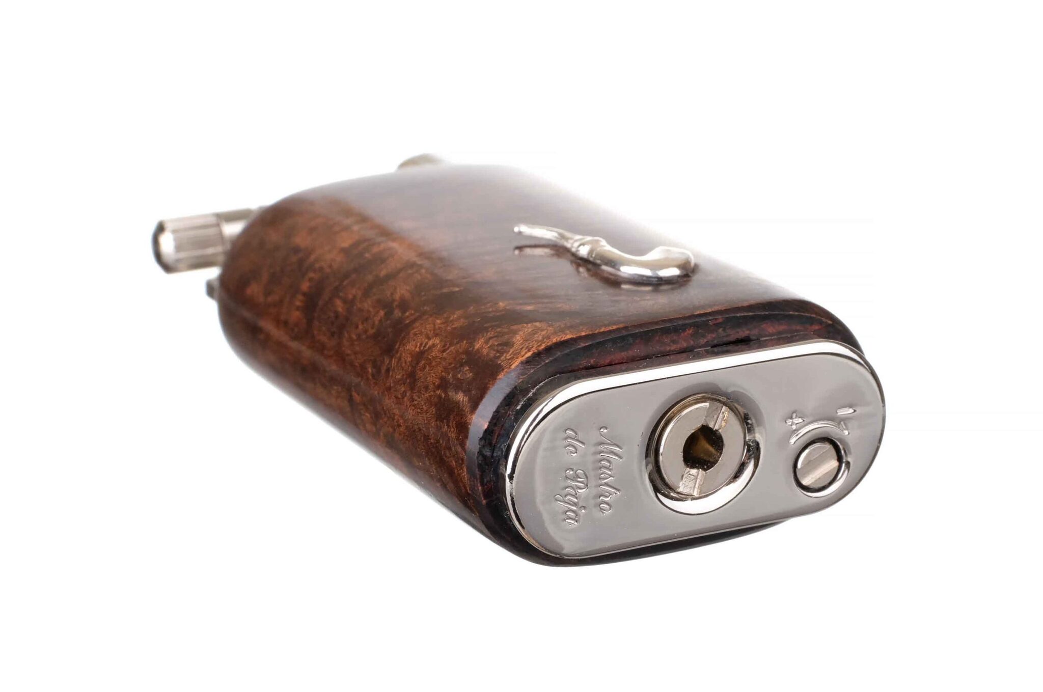 Внешний корпус выполнен из массива бриара — корнекапа древовидного вереска — красивого и дорогого материала, из которого изготавливаются курительные трубки. Эмблема с курительной трубкой на корпусе из серебра 925 пробы.Заправка газовым баллончиком со стандартным наконечником. Переходник не требуется. Заправочный клапан и винт регулировки высоты пламени находятся снизу.Кремень в механизме поджига универсальный. Для его замены в процессе эксплуатации необходимо выкрутить наружный торцевой винт в верхней части зажигалки, вынуть старый кремень и заменить на новый.Поставляется в фирменном кисете и подарочной коробке с буклетом Mastro de Paja.